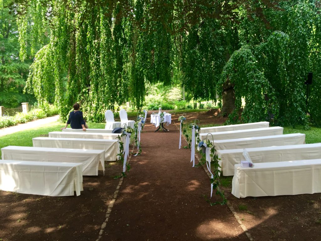 Anne und Craig gaben sich am 28. Mai 2016 in der Villa Haar in Weimar das Ja-Wort. Unter einer großen Weide im Park war alles für die Hochzeitszeremonie aufgebaut. Giovanna (Englisch) und ich (Deutsch) hatten uns gut auf den Tag vorbereitet. Die Rede im Gepäck, machten wir uns ans Aufbauen für diese bilinguale Trauungszeremonie. Erwartet wurden Gäste aus Deutschland und Großbritannien – eine wirklich tolle Gesellschaft, insbesondere der Craigs Trauzeuge. Schon vor der Trauung hatten wir viel Spaß – denn das ist für uns wichtig – die Nervosität nehmen und Lachen.
