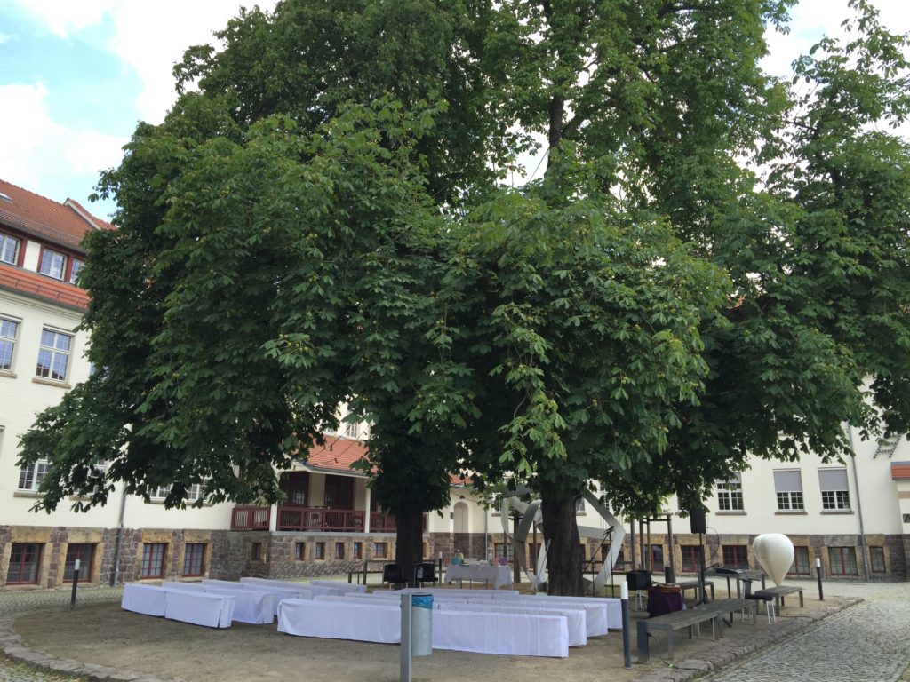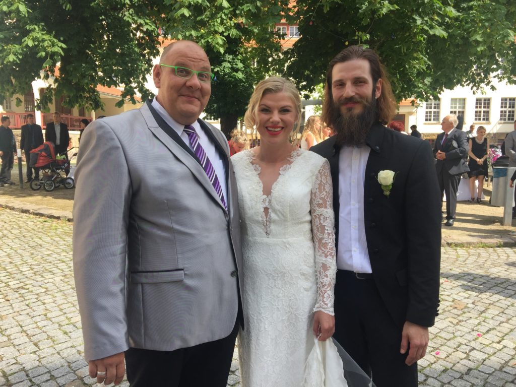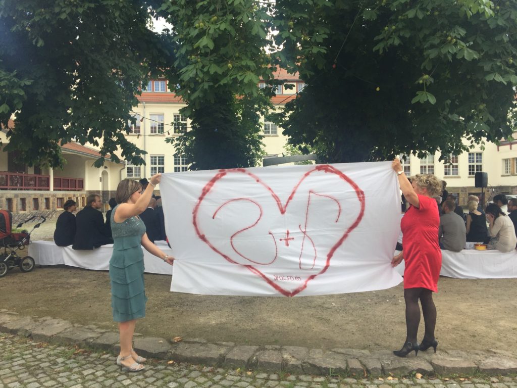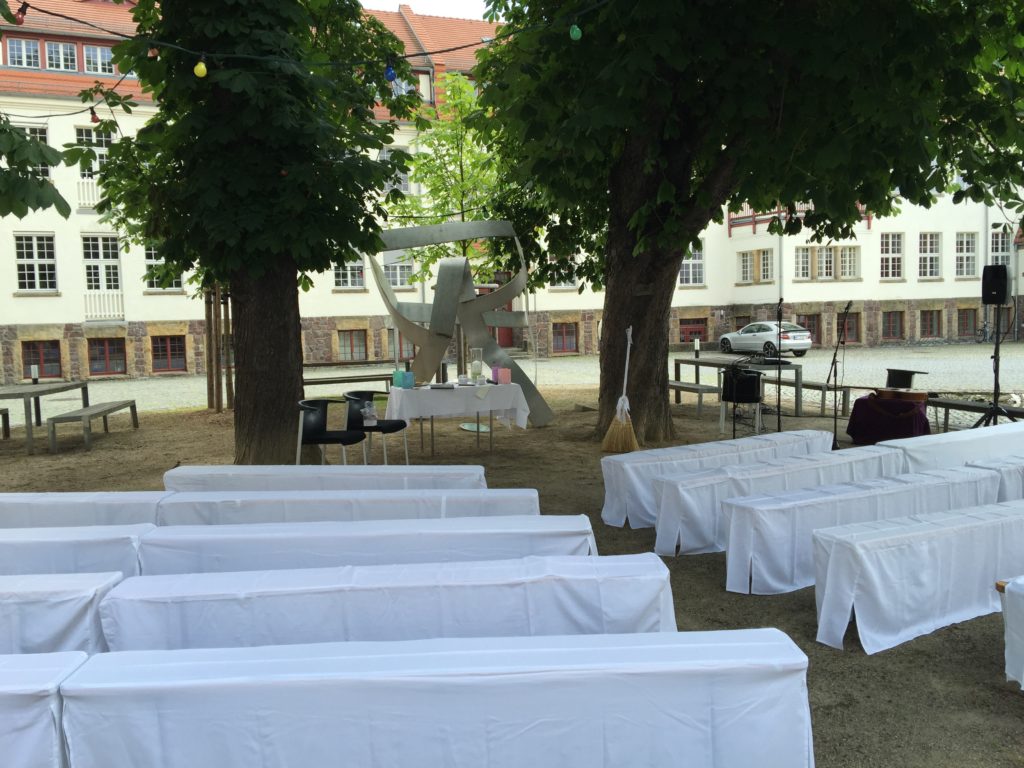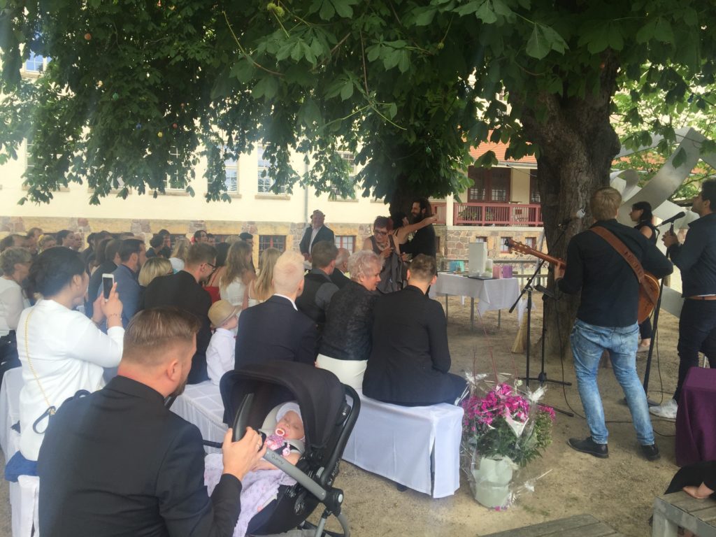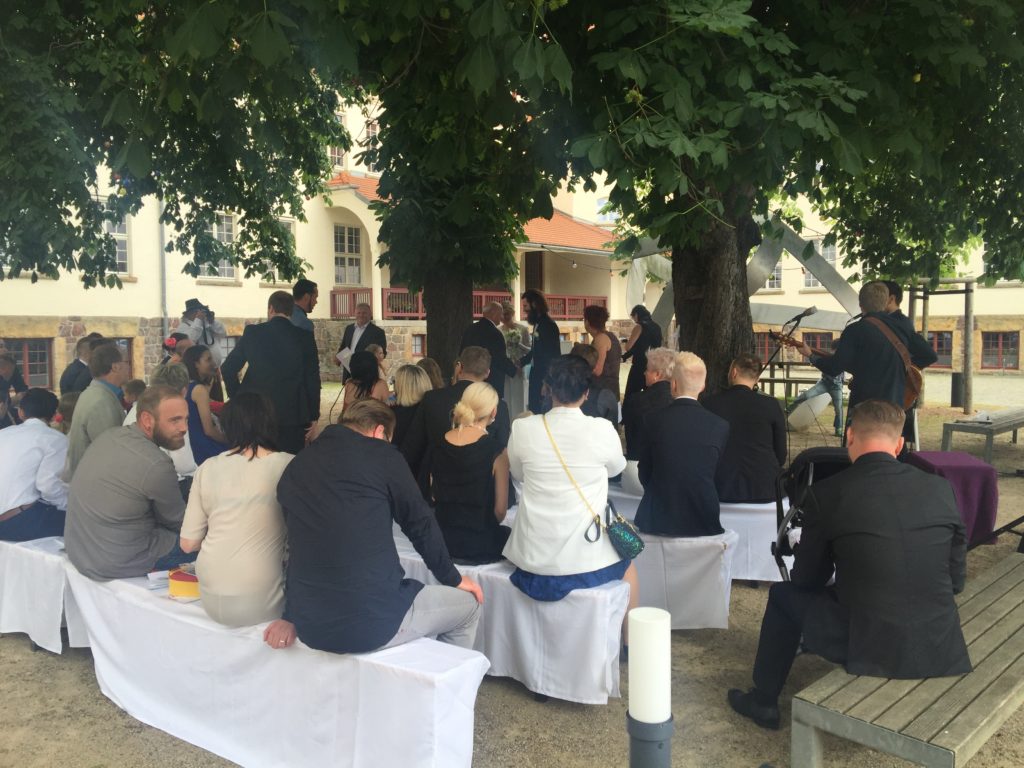 Im Innenhof, direkt unter einem alten Kastanienbaum war der Trautisch aufgebaut. Auch musikalisch hatten sich die Zwei besondere Lieder ausgesucht, z. B. „A Little Respect“ im Original von Erasure setzte den Schlusspunkt für eine außergewöhnliche Zeremonie. Die Musik kam live von einem Sänger und einem Gitarristen, der gleichzeitig noch ein Beatboxer ist.