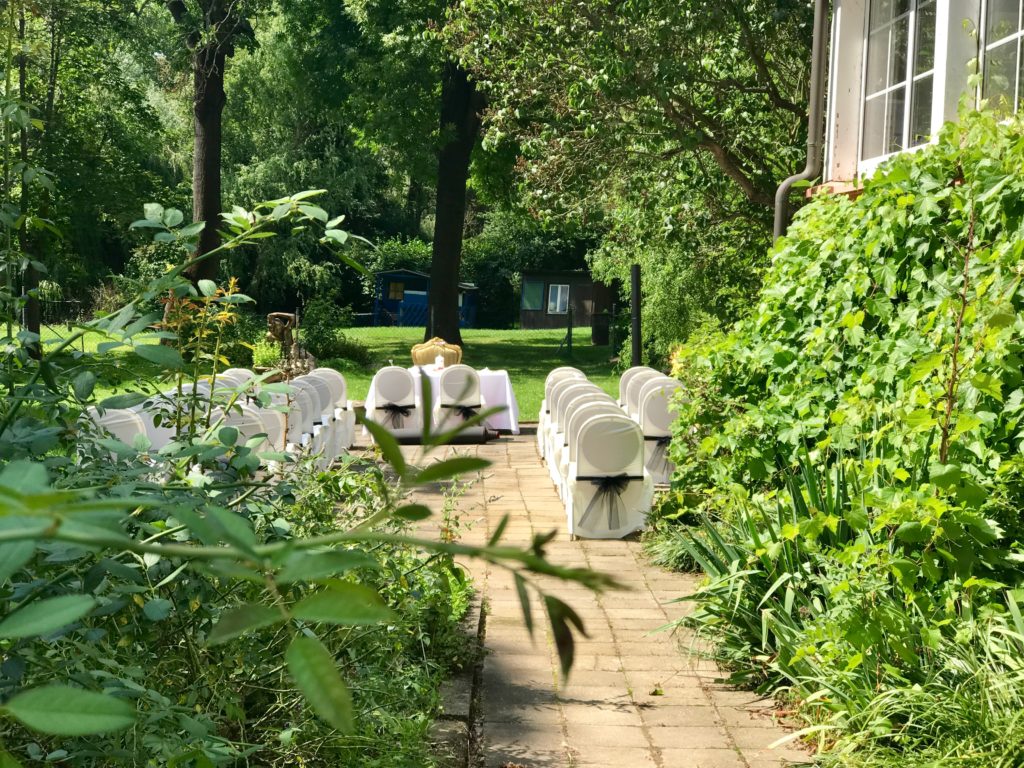 Im verwunschenen Garten fand die freie Trauung statt. Das Besondere: Es war eine Hochzeit in schwarz. Ein traumhaftes Hochzeitskleid in schwarz und weiß hatte sich Anjana ausgesucht und bezauberte damit ihre Gäste und natürlich ihren Friedemann. Ich bin zu fast jeder Zeremonie bereit und auch diesmal habe ich mein Bestes für die beiden gegeben. Nein ich bin kein Pfarrer, aber ich bin ein gläubiger Mensch. Und so erfüllte ich Friedemanns Wunsch nach einem christlichen Bezug in der Trauzeremonie.