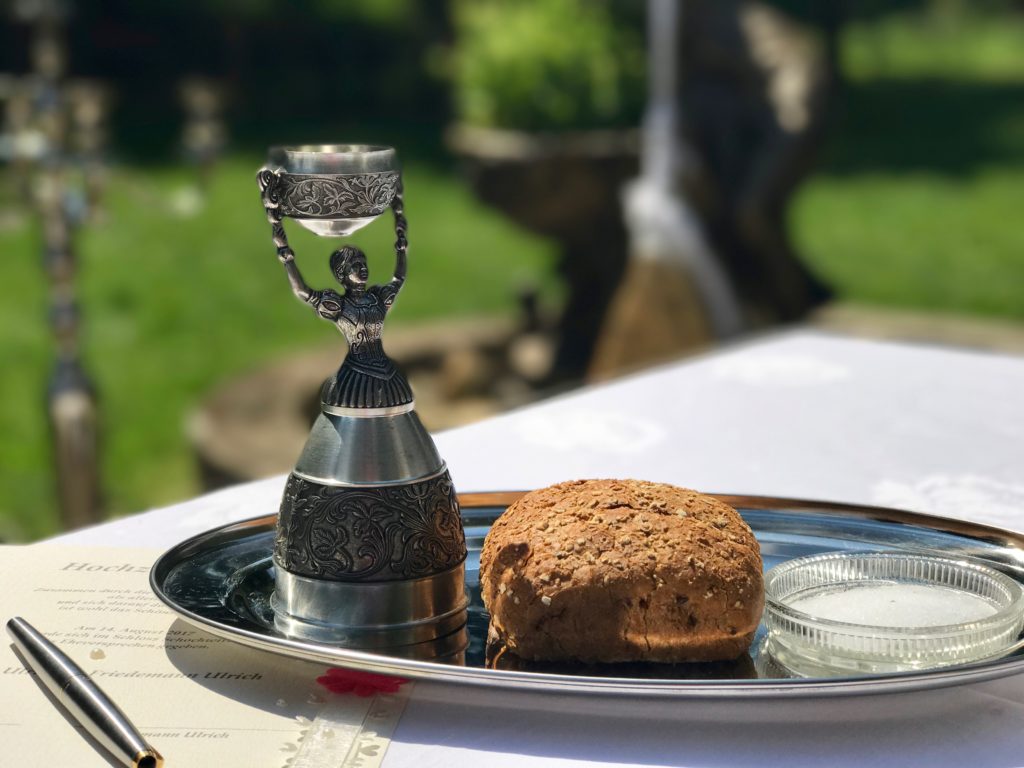 Friedemanns Leitmotiv im Leben ist der Psalm 23, „Der Herr ist mein Hirte“ und nicht nur den konnte das Brautpaar und seine Gäste in meiner sehr persönlichen Rede wiederfinden. Es waren sehr emotionale Momente an diesem Montagnachmittag auf Schloss Schochwitz. Beim Ringwechsel setzten Anjana und Friedemann noch einen drauf: Ein ganz besonderes Familienmitglied, nämlich die Hündin, brachte die Ringe zu Herrchen und Frauchen und war so auch Teil der Zeremonie.