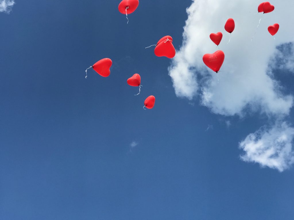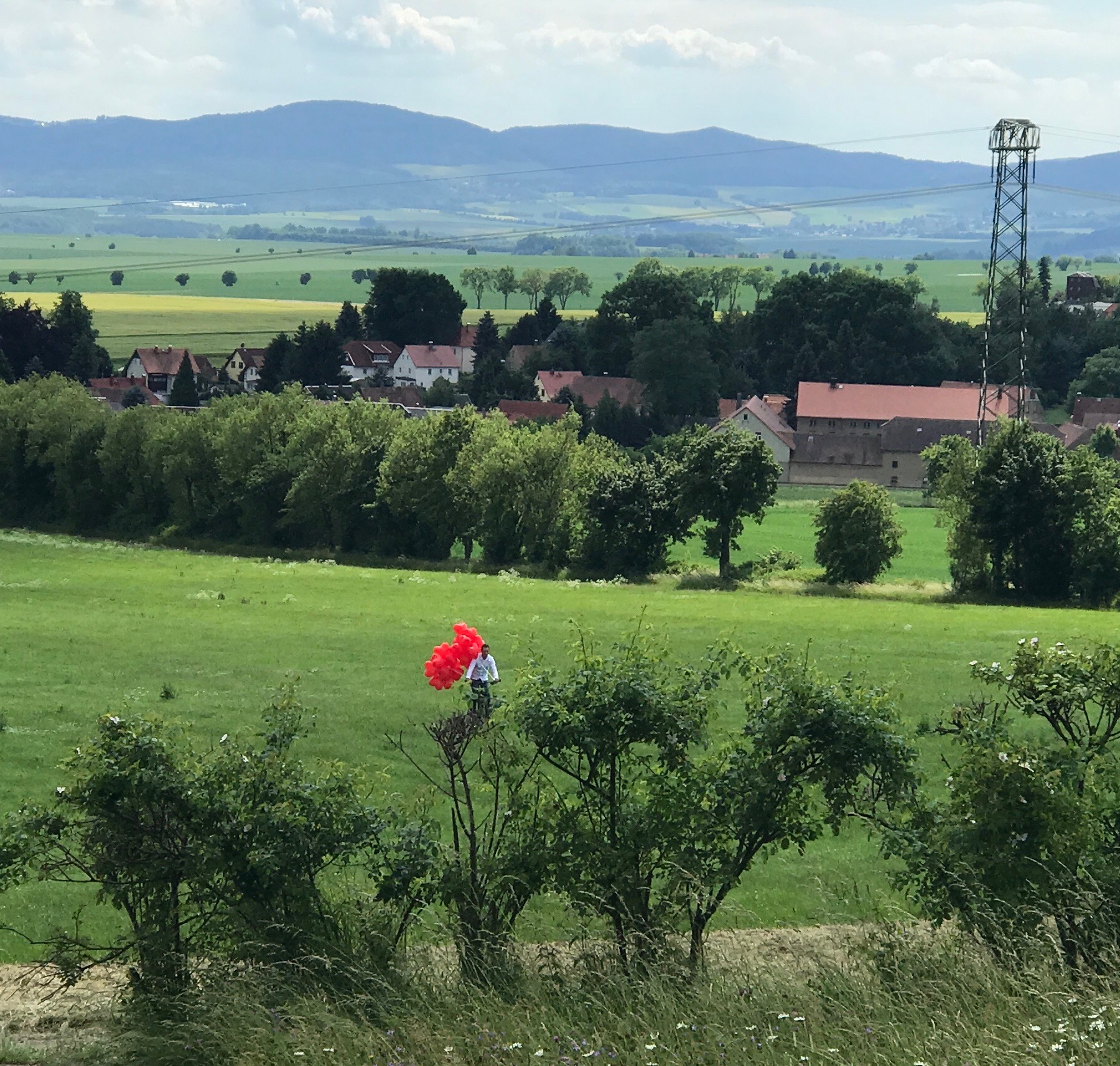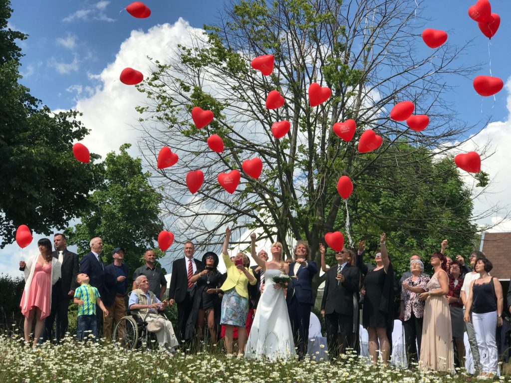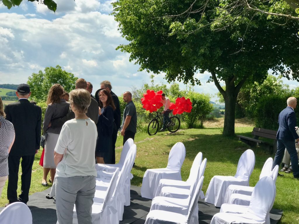 Eine wunderbare Überraschung gab es dann am Ende: Noch während die Trauung lief, hatte sich ein Freund mit dem Fahrrad und vielen roten Herzballons über die Wiese auf den Weg zum Schanzberg gemacht. Er musste ziemlich in die Pedale treten um den Gipfel zu erklimmen. Es war ein tolles Bild und ein tolles Motiv für den Fotografen, als am Schluss viele Ballons in den Himmel stiegen.